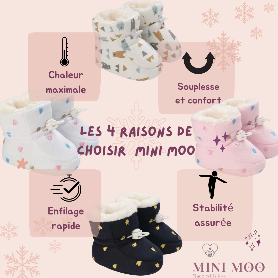 Les chaussons MiniMoo™ offrent une protection parfaite contre le froid grâce à leur doublure en flanelle douce.